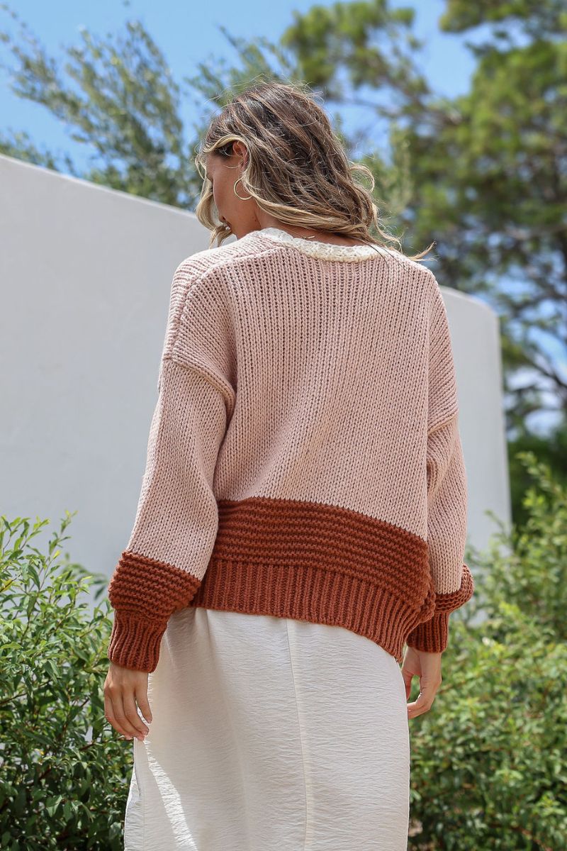 The Autumn Coast Knit Cardigan is the perfect blend of relaxed comfort and effortless style. Crafted in a soft, textured knit, this open-front design features a beautiful colour-block palette of blush pink, warm rust, and creamy neutral tones. The chunky ribbed cuffs and hem add depth and structure, while the contrasting trim along the front creates a refined finish.