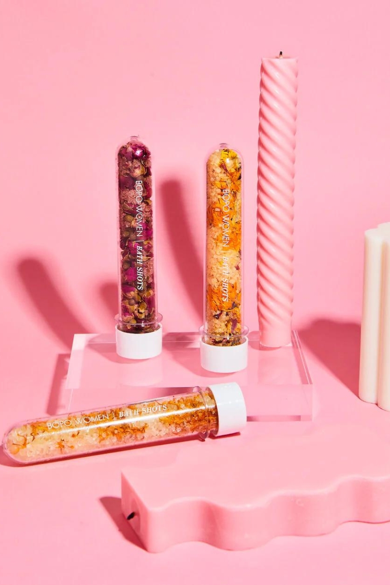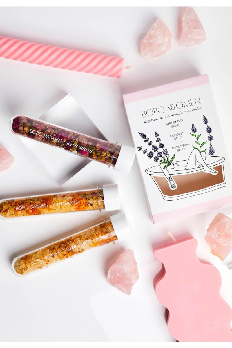 A beautiful trio of Bopo Bath Shots. Each bath shot features a 100% pure blend of essential oils, mineral rich salts, fruit extracts, clays & organic flowers. Ingredients have been carefully selected to deeply nourish skin, whilst helping you to unwind and let go. Includes a Surrender Soak, Goddess Soak & Daydream Soak.