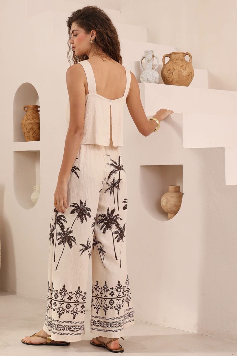 The pants showcase a stunning palm-tree print and detailed boho border, adding a touch of tropical elegance to the look. Light, airy and beautifully comfortable, this set drapes naturally and moves with ease — ideal for warm days, holiday escapes, or elevated everyday wear.