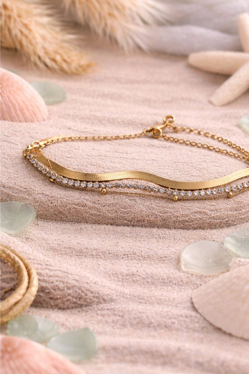 Effortlessly elegant with a modern coastal edge, the Golden Tide Waterproof Bracelet features a fluid herringbone-style gold band paired with a delicate strand of shimmering crystals and fine chain detailing. The layered design creates soft movement and sparkle, making it perfect for everyday wear or special occasions.