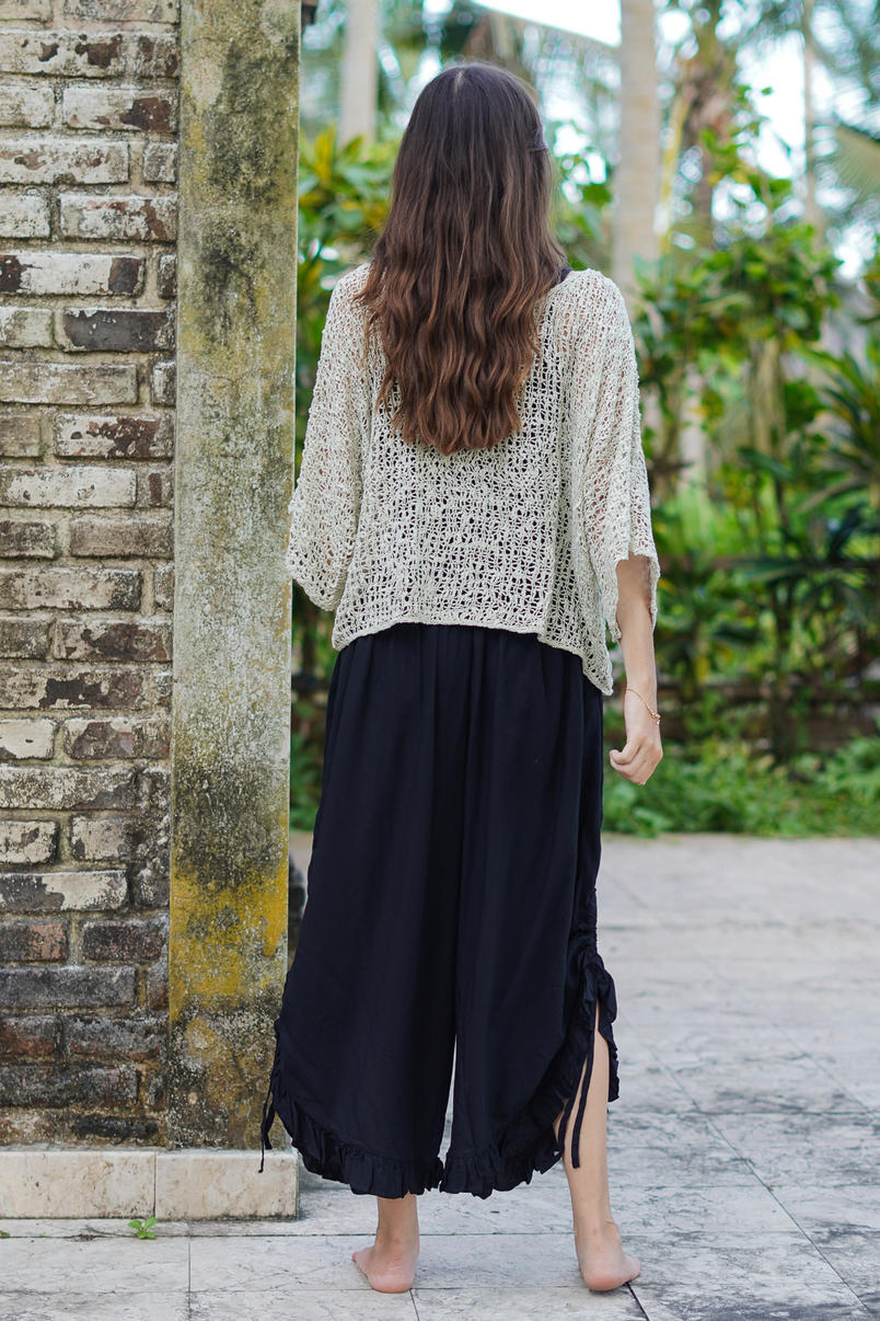 Crafted in classic black, these pants are endlessly versatile — perfect for dressing up or down. The playful ruffle hemline adds a feminine boho finish, while the lightweight fabric keeps you cool and comfortable all day long.