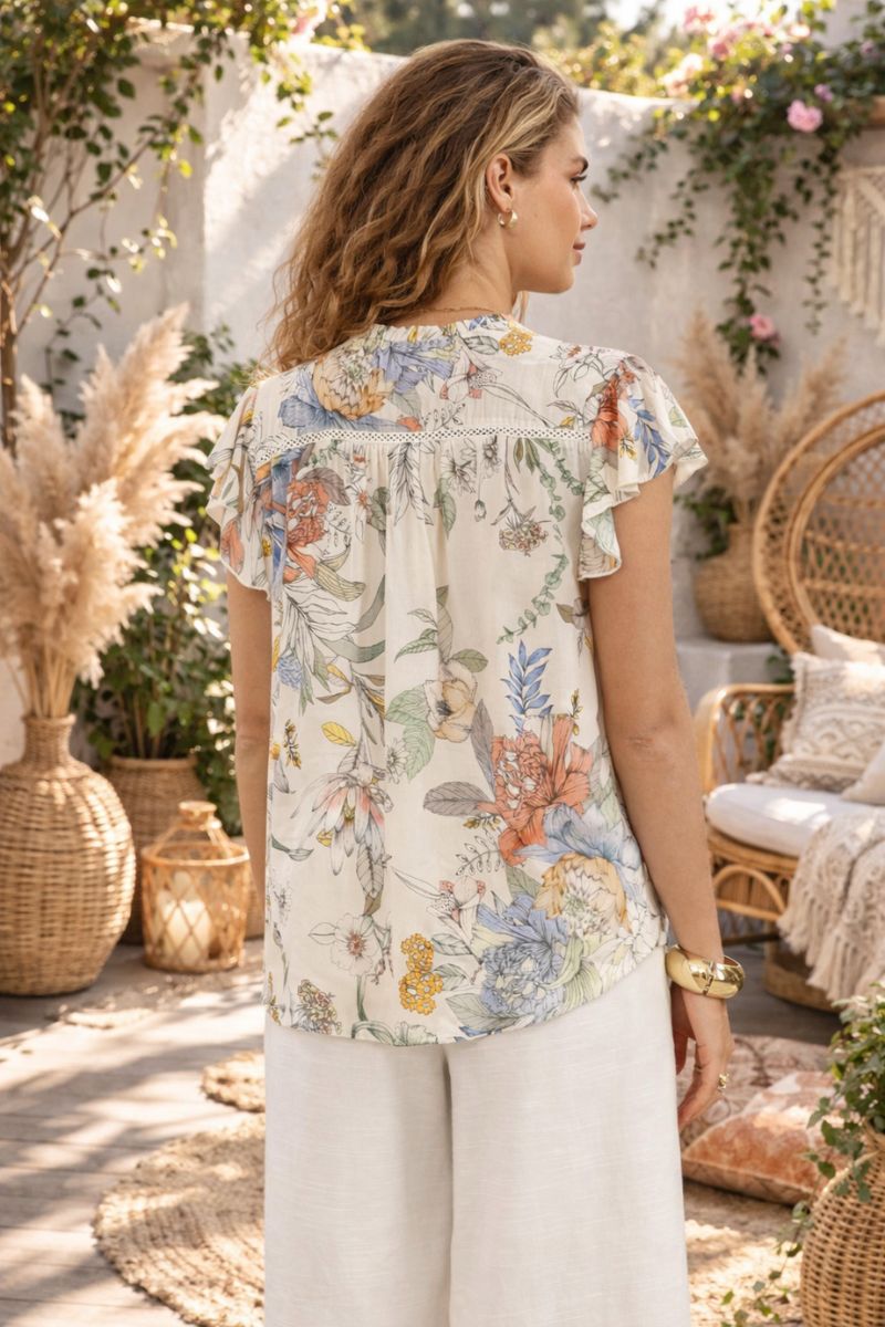 The Meadowlight Blouse is the perfect companion to our Meadowlight Palazzo Pants, designed to create an effortlessly coordinated bohemian look. Featuring the same romantic pastel floral print on a soft ivory base, this piece blends blush, sage, sky blue and warm apricot tones in a beautifully balanced garden-inspired design.