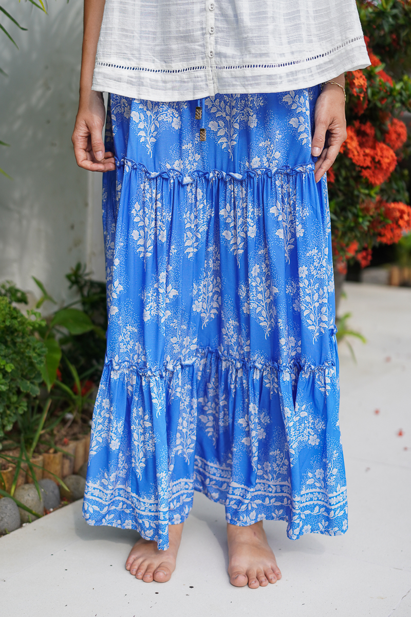 Crafted in a lightweight rayon fabric, this tiered skirt drapes beautifully with every step. The ocean-blue base is adorned with delicate white floral prints, finished with a soft border hem that adds a touch of boho charm. Designed with comfort in mind, the elasticated drawstring waist gives a flexible fit that flatters all body shapes.