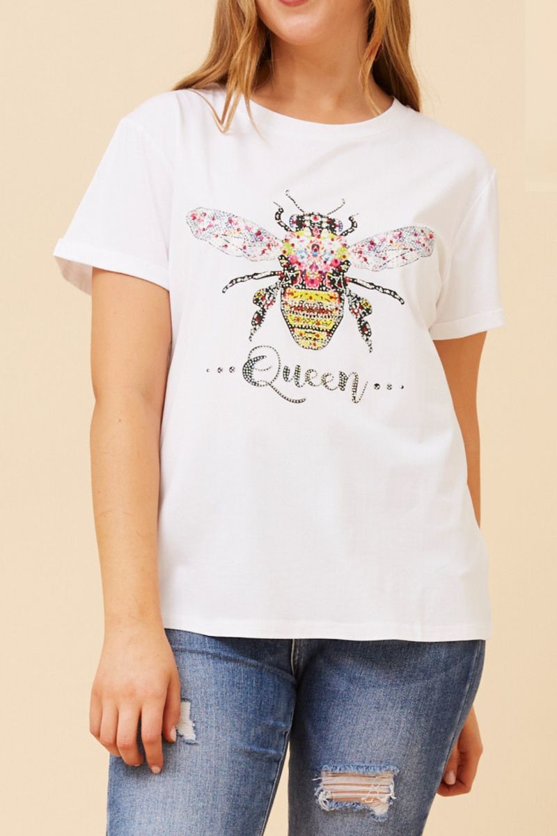 The Queen Bee Beaded Tee, a striking white top adorned with intricate beaded Queen Bee detailing in soft, feminine colours. Super soft comfortable fabric,