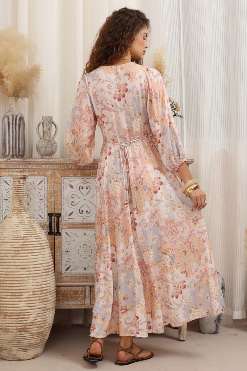 Soft, feminine and effortlessly elegant — the Rosewater Bloom Maxi Dress is a dreamy blend of romance and bohemian charm. It features a delicate floral print in muted rose, peach and cream tones on a soft powder-blue base.