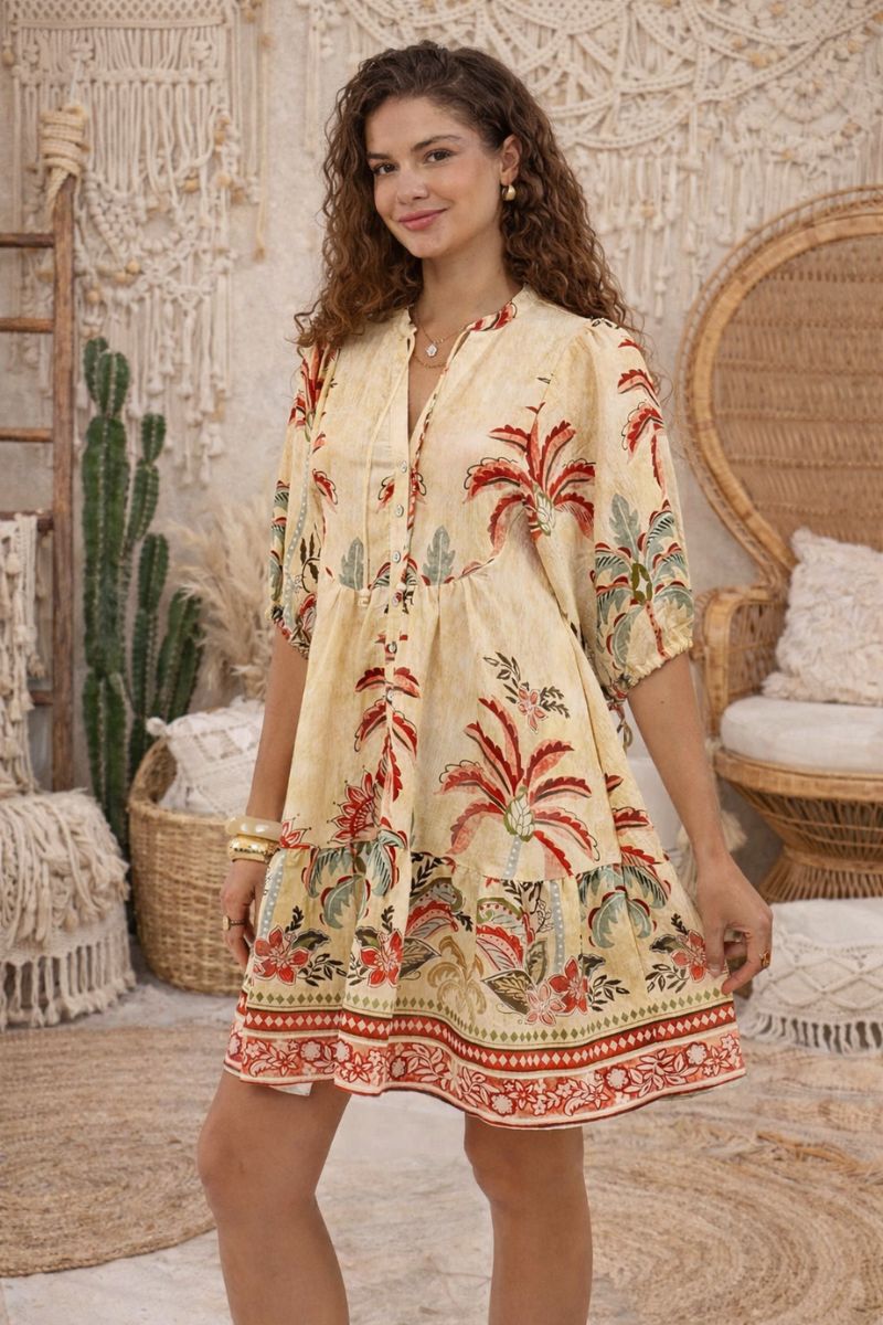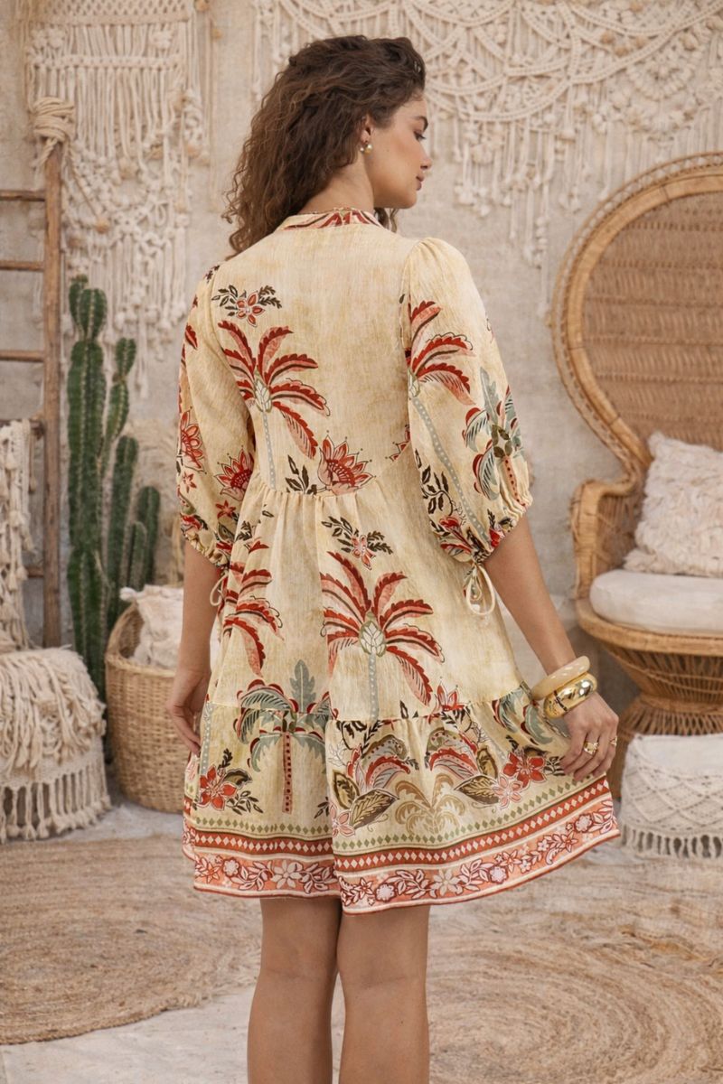 Featuring a warm neutral base adorned with rich botanical and palm-inspired prints in tones of terracotta, sage and soft coral, Sedona feels grounded yet feminine. The flattering button-front neckline adds subtle detail, while the relaxed babydoll silhouette flows into a softly gathered tiered hem for beautiful movement.