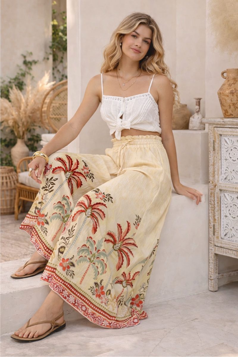 Showcasing the signature Sedona border print with its warm, earthy tones and intricate detailing along the hem, these palazzos are designed to pair perfectly with the Sedona Blouse for a coordinated bohemian set.
