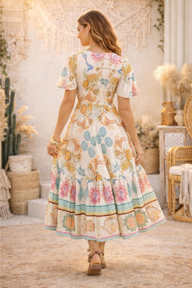 Designed with a romantic V-neckline, flutter sleeves and a softly fitted waist, Sundara falls into a flowing full-length skirt adorned with an exclusive bohemian-inspired print in warm, earthy tones.