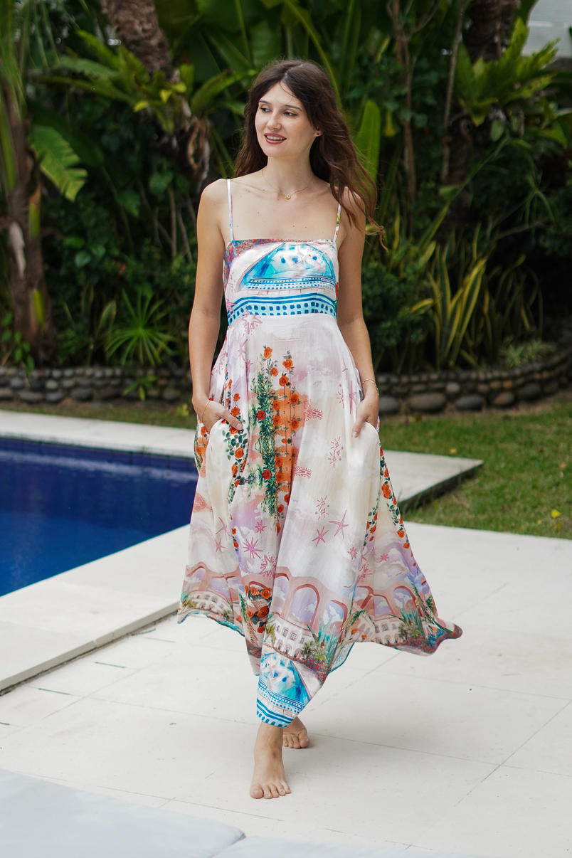 Featuring delicate spaghetti straps, a soft straight neckline, and a relaxed A-line silhouette, it drapes effortlessly while offering a flattering, feminine shape. The print is its true magic — a picturesque Mediterranean-inspired scene of archways, fountains, and lush gardens, detailed in pastel tones of sky blue, blush pink, and terracotta, accented with cascades of bright florals.
