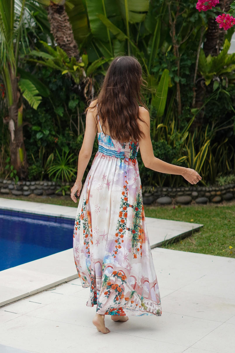 Every step feels like walking through a sun-drenched villa garden, making this dress both a statement piece and a timeless boho treasure.