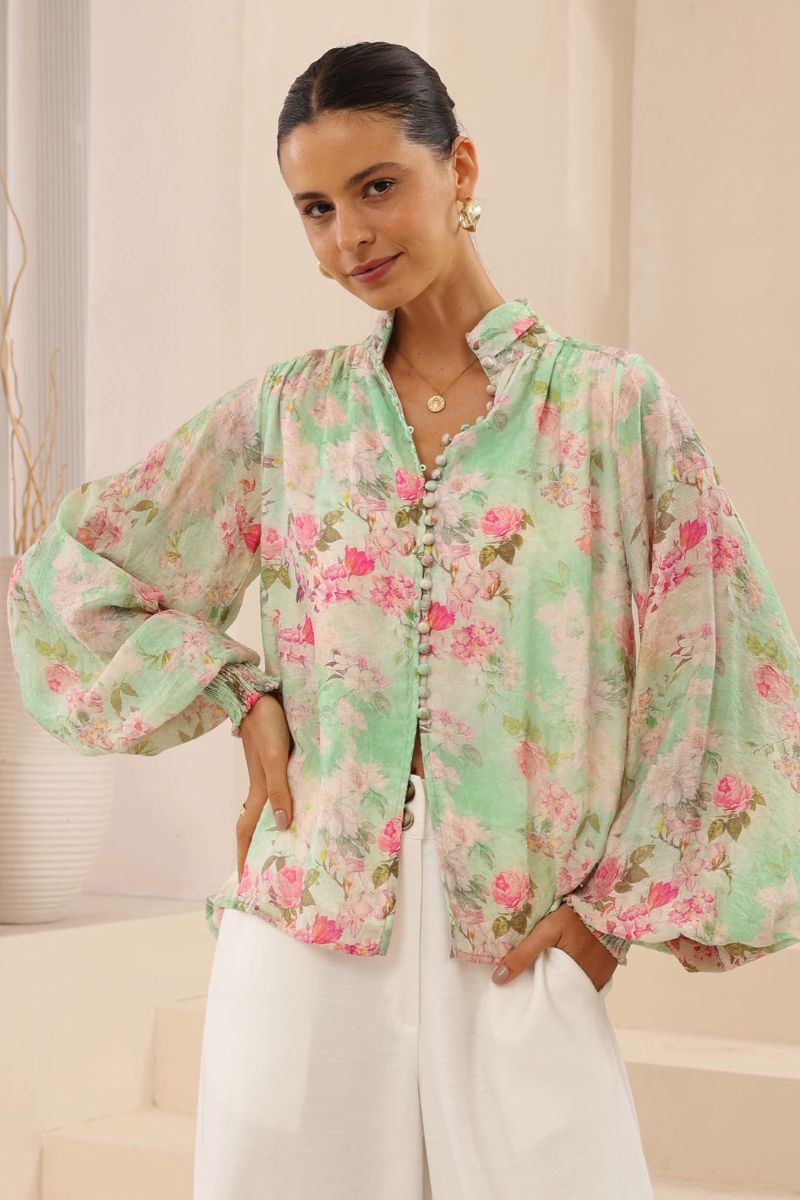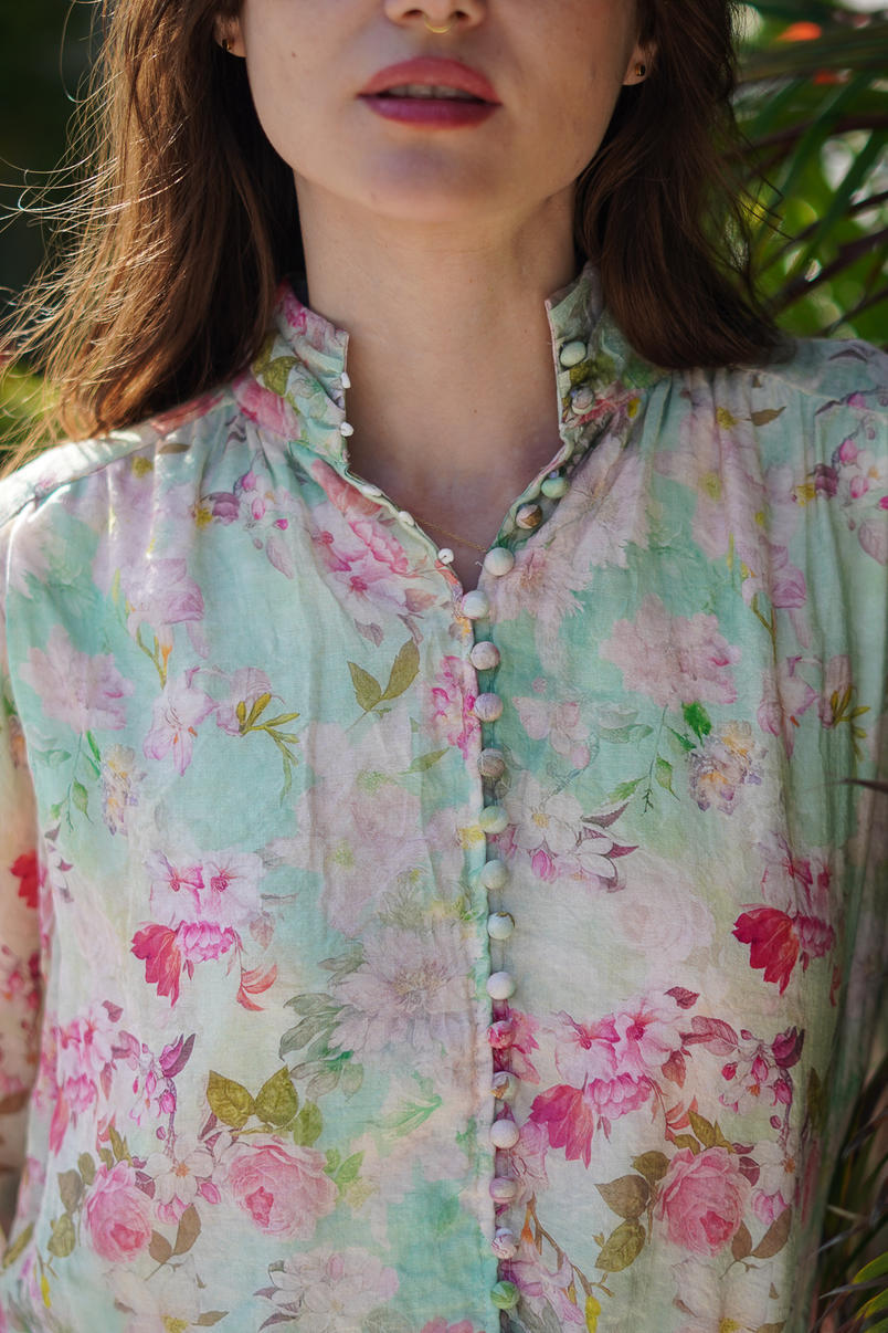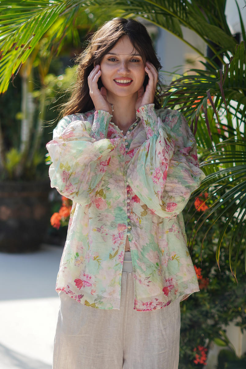 The Wildflower Whisper Blouse is a romantic nod to nature’s beauty, blending delicate florals with a lightweight, airy silhouette. Featuring a soft pastel palette of blush pinks, mint greens, and touches of lavender, it feels like wearing a spring morning.